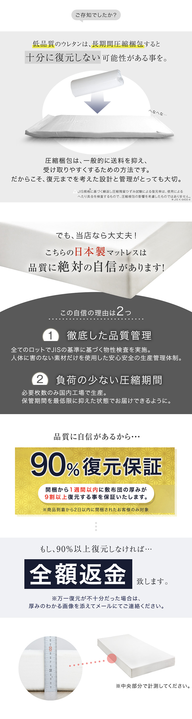 ※圧縮梱包のマットレスについて、ウレタンフォームの感温性(反発弾性フォームは温度が高くなると柔らかくなり、低くなると硬さが高くなる性質)により冬場、寒いところで復元させると、復元に時間がかかります。又、部分的に復元するタイミングが異なる場合がございます。室温が18度以上の部屋に半日くらいおくと、回復がしやすくなります。