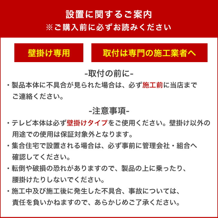 ・テレビ本体は必ず壁掛けタイプをご使用ください。壁掛け以外の用途での使用は保証対象外となります。