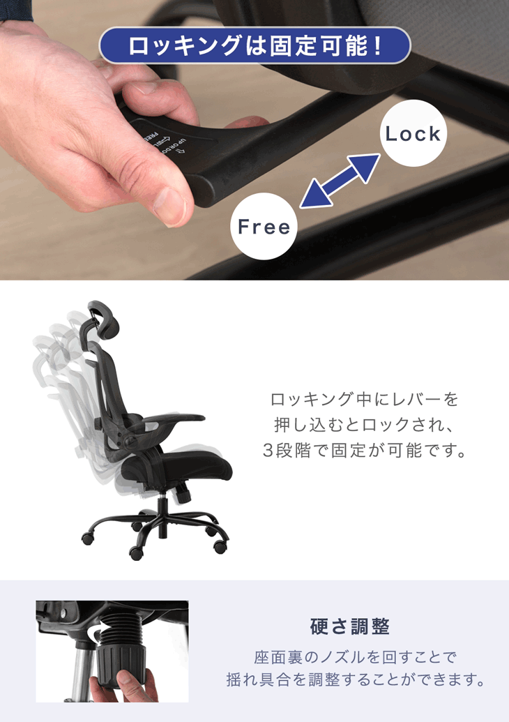オフィスチェア メッシュ 肘 跳ね上げ ロッキング チェア 椅子 アームレスト おしゃれ ハイバック 肘付き キャスター付き 回転 オフィスチェアー キャスター