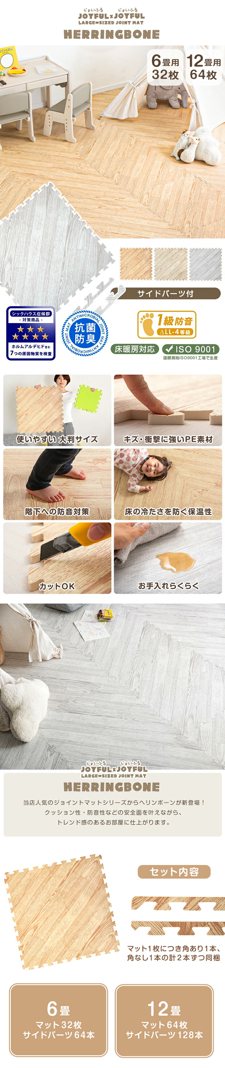 ジョイントマット 大判 厚手 ヘリンボーン柄 木目 6畳 32枚 防音マット 床マット クッションマット プレイマット パズルマット ベビー 赤ちゃん