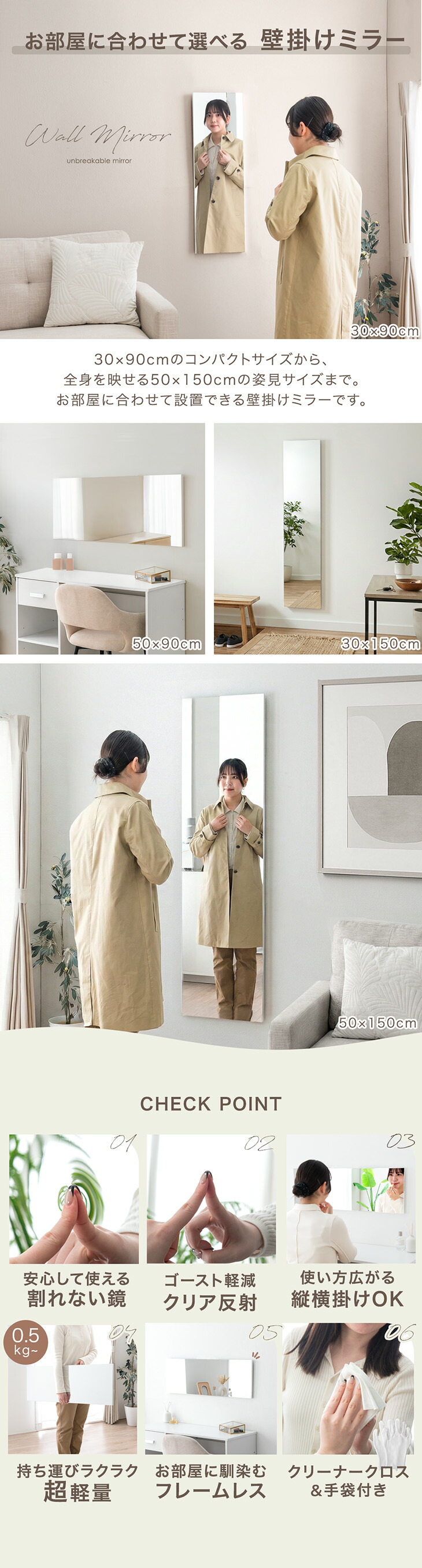 鏡 壁掛け 割れない おしゃれ 安全 姿見 壁掛け鏡 超軽量 フレームレス 50×150 フィルム 割れない鏡 ミラー シンプル 子供 賃貸 軽量 フィルムミラー