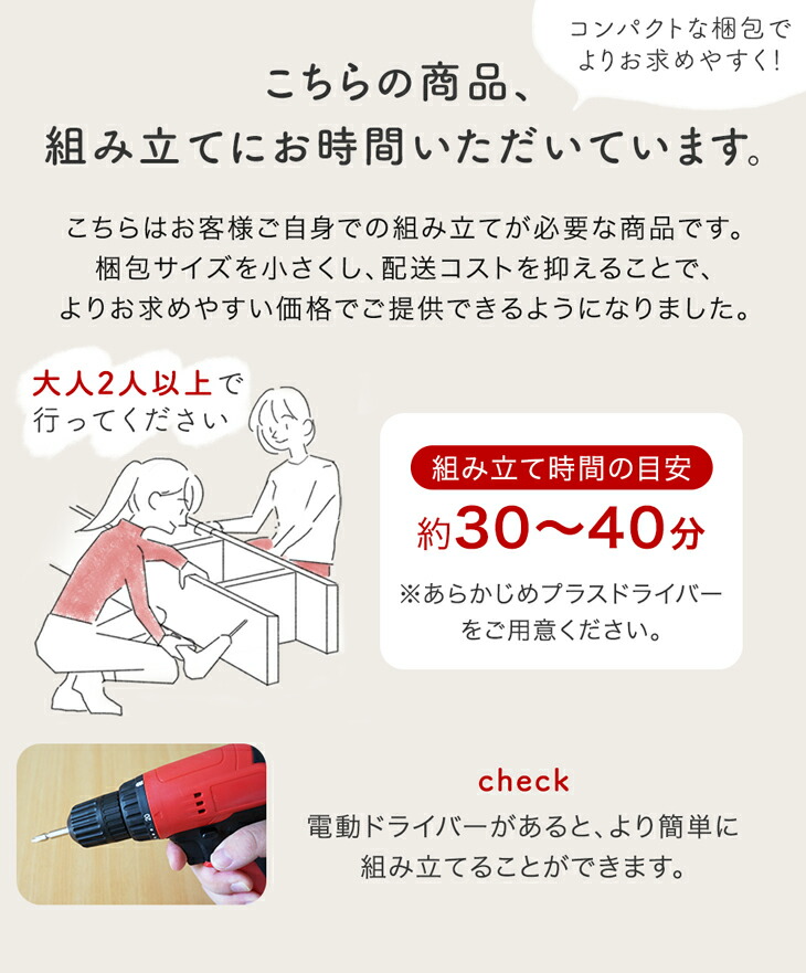 ※配送は全て宅配便(1人)での玄関渡しとなります。大型商品や重量商品、エレベーターの無い2階以上にお住まいのお客様は、玄関口までの搬入をお手伝いをお願いしております。