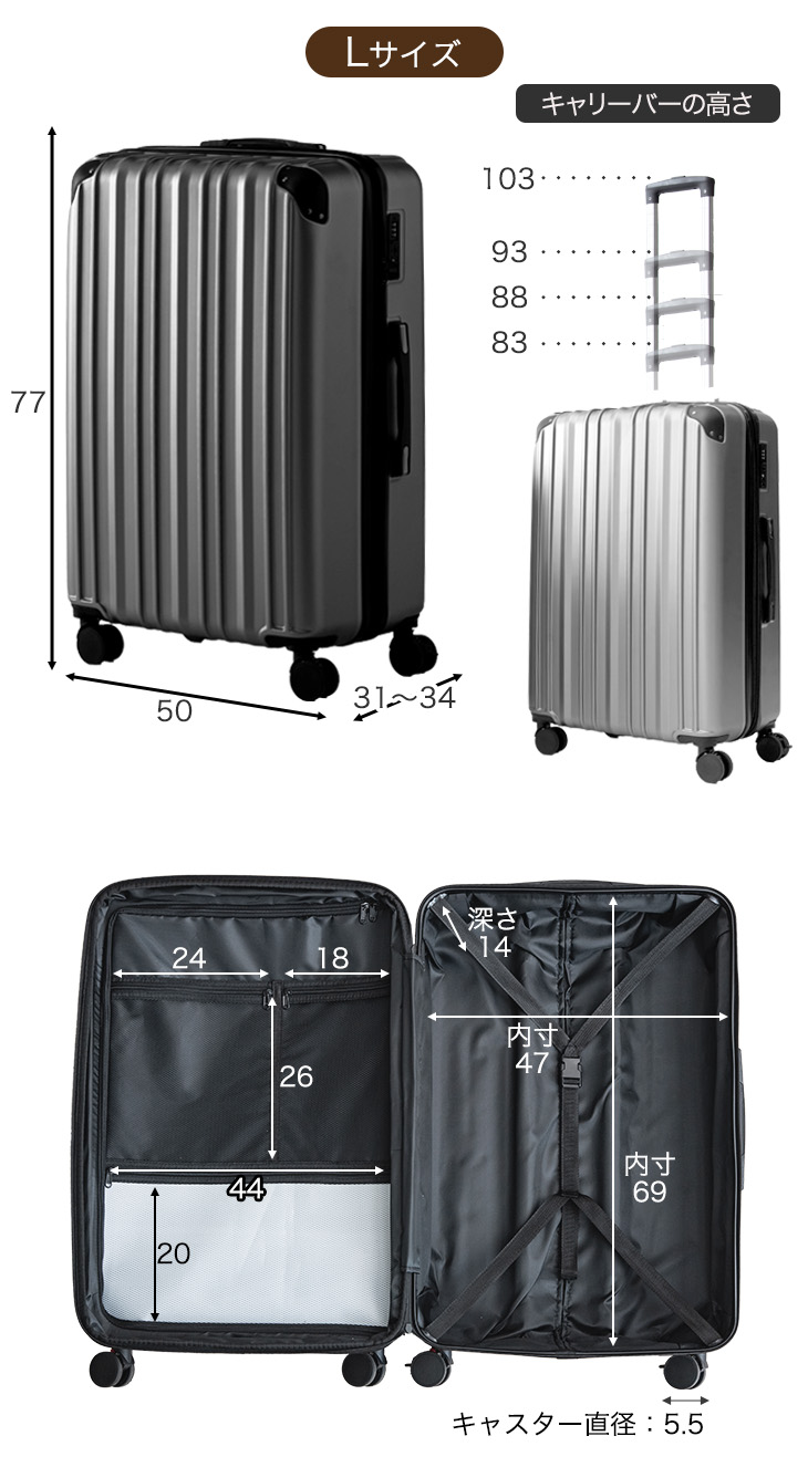 13日+5% スーツケース 大容量 Lサイズ 111L 拡張 キャリーケース 4泊5日 消音 ダブルキャスター L tsaロック キャリーバック 旅行