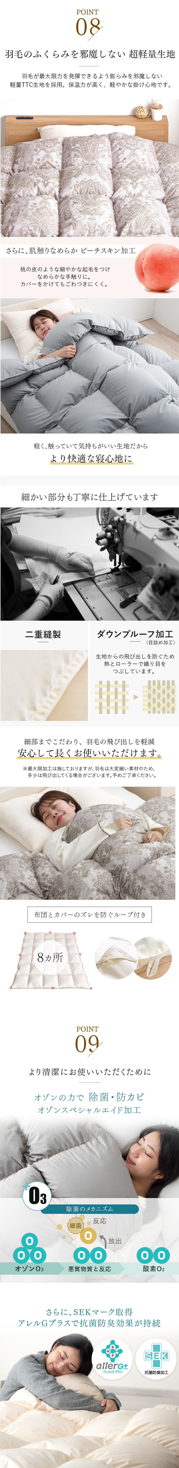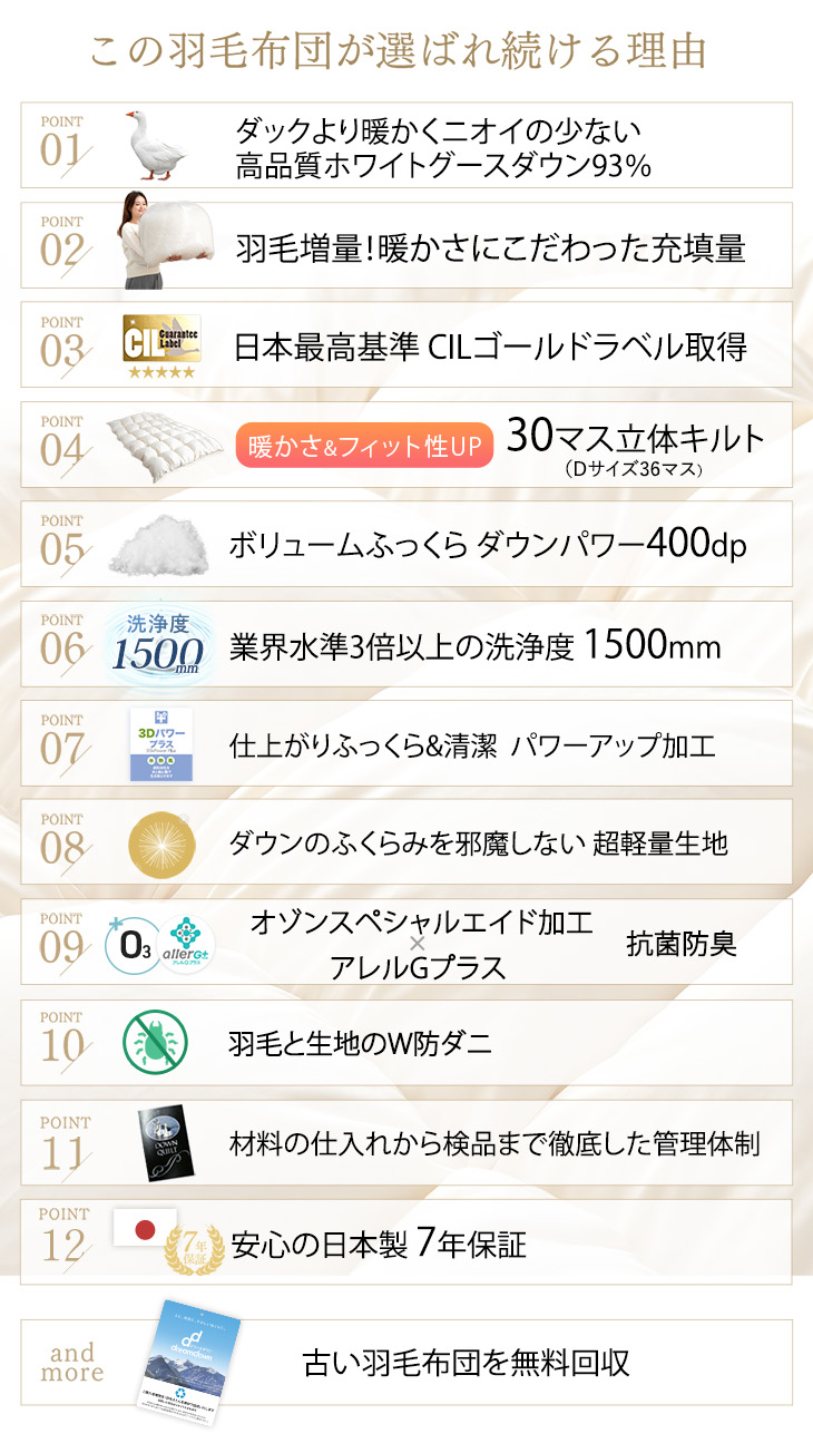 ※ 羽毛は天然素材となりますため、無臭ではございません。原毛は様々な取り組みにより改善しておりますが、開梱直後や温度・湿度等の環境等により臭いを感じる場合がございます。