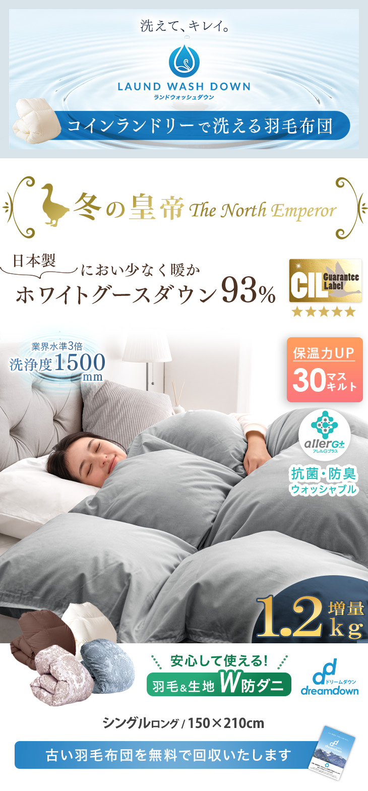 詰め物:ホワイトグースダウン93%、フェザー7%