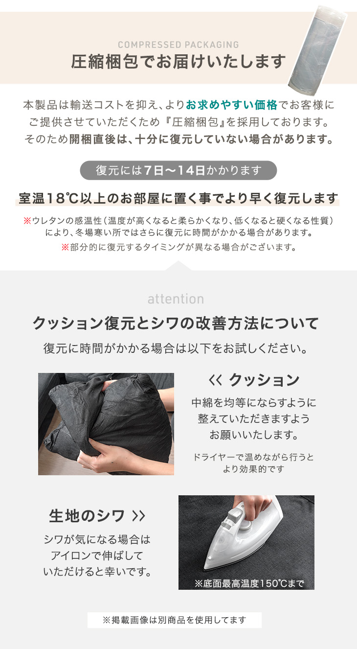 ・カバー:生地のシワがなかなか取れない場合は、低温(150℃まで)でアイロンをかける事で改善いたします。