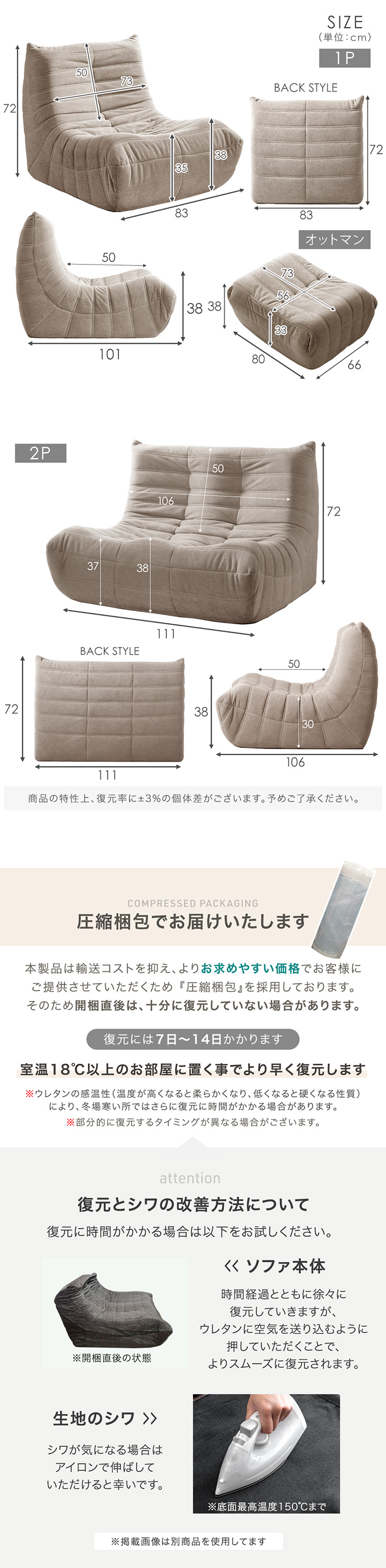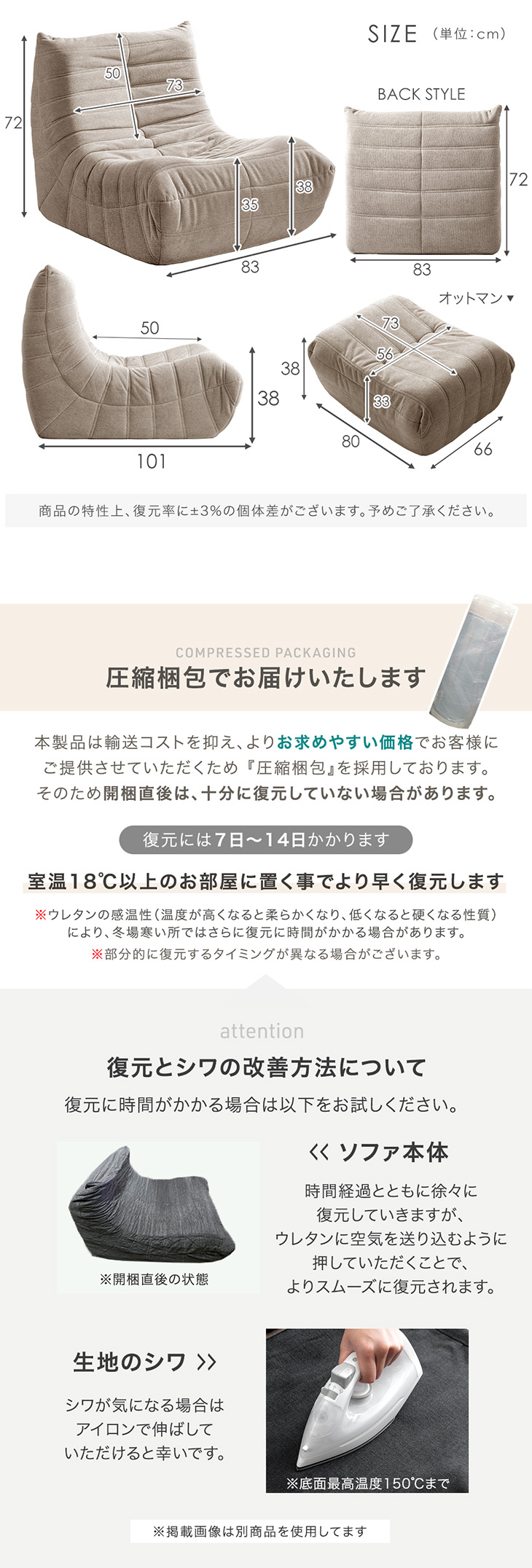 ※本商品は圧縮梱包でお届けいたします。通常開封から1〜2日で復元しますが、気温や室温によっては3〜14日程かかる場合もございます。