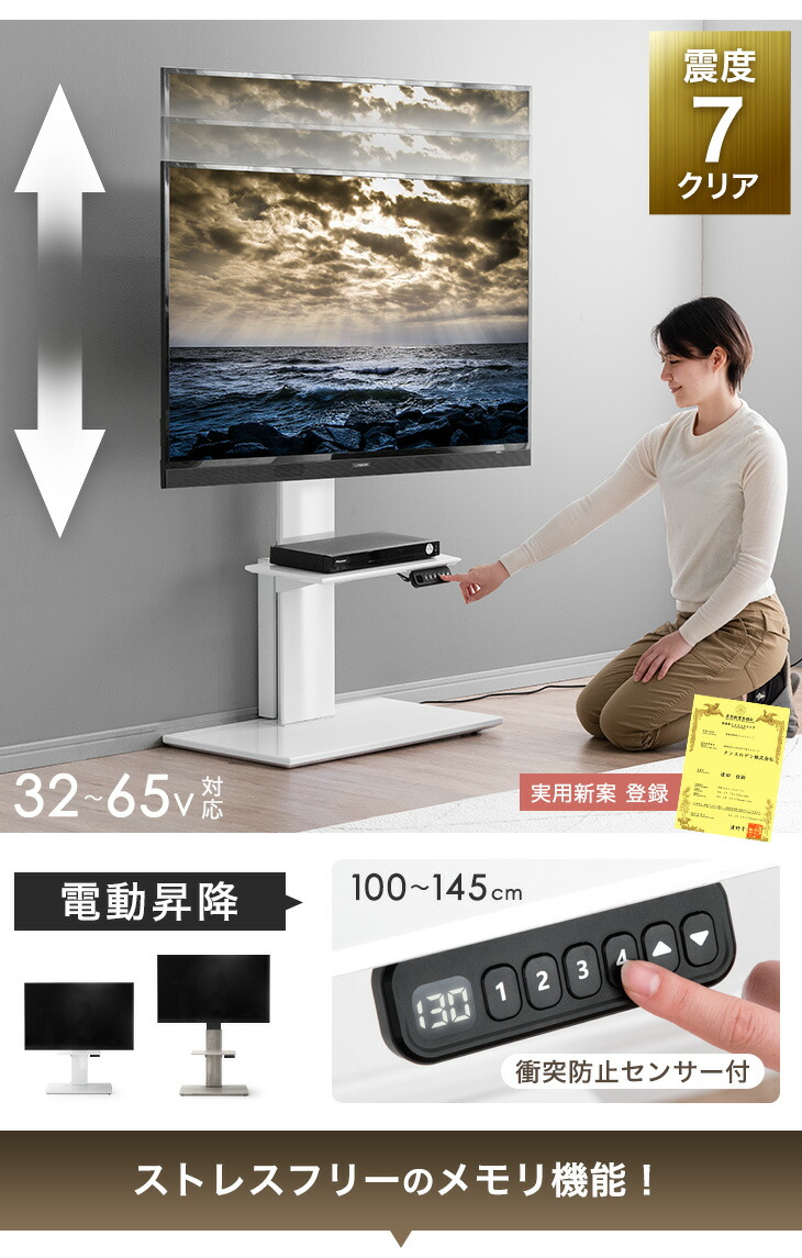 テレビスタンド 電動昇降 メモリ機能付き テレビ台 キャスター付き 壁寄せ 上下/左右 首振り 32〜65インチ 対応 隠しキャスター付