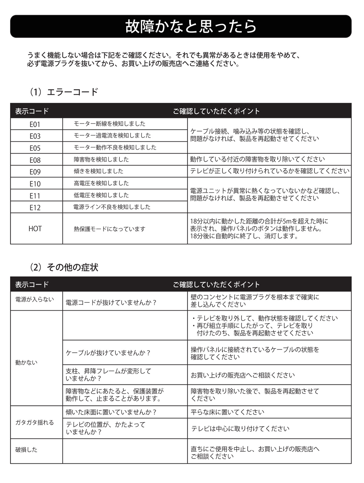 テレビ取付部:約40kg以下(65インチテレビ以下VESA規格対応)