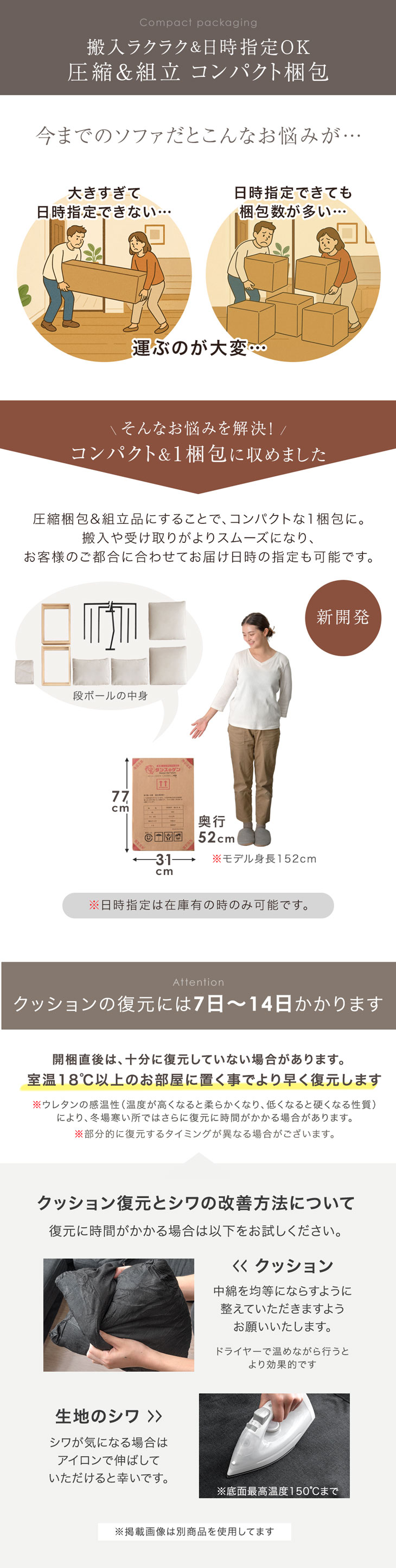 ※圧縮梱包でお届けいたします。開梱直後は圧縮状態から十分に復元しておりません。完全に復元するには7日〜14日程度かかる場合がございます。また部位ごとに復元の速度が異なる場合があります。