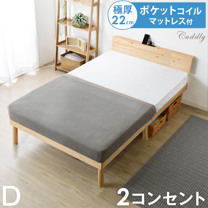 ベッド マットレス付き すのこベッド ダブル マットレス 宮付き ベッドフレーム ポケットコイル ベッド すのこベッド 宮棚 天然木