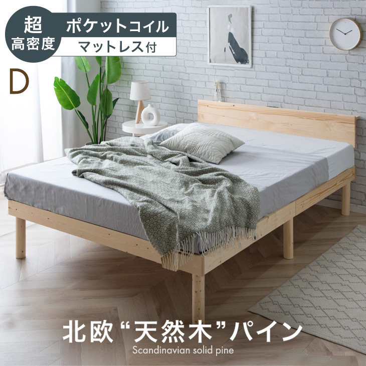 ベッド マットレス付き 超高密度 ポケットコイル ダブルベッド すのこベッド ダブル コンセント付き 木製 宮付き ベット マットレスセット