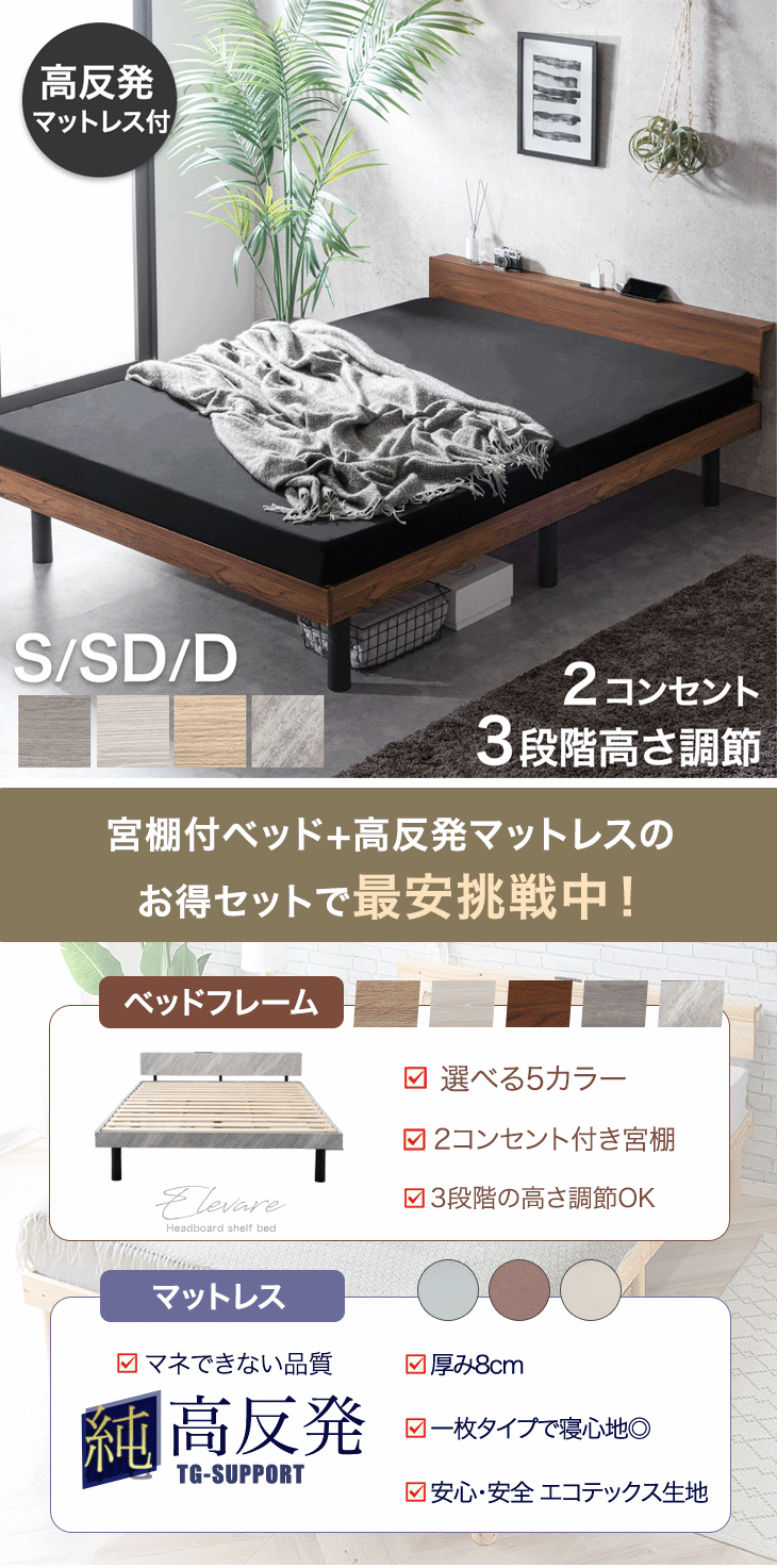 ベッド マットレス付き シングル すのこベッド 8cm 宮付き ベッドフレーム 高さ調節 高反発マットレス すのこ おしゃれ 高反発 セット コンセント