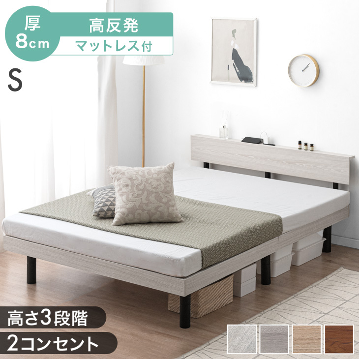 シングルベッド マットレス付 厚8cm 高反発マットレス ベッド 3段階 高さ調整 シングル すのこベッド コンセント付き 宮付き ベット マットレスセット