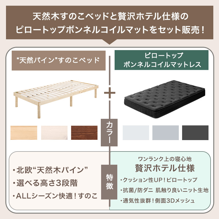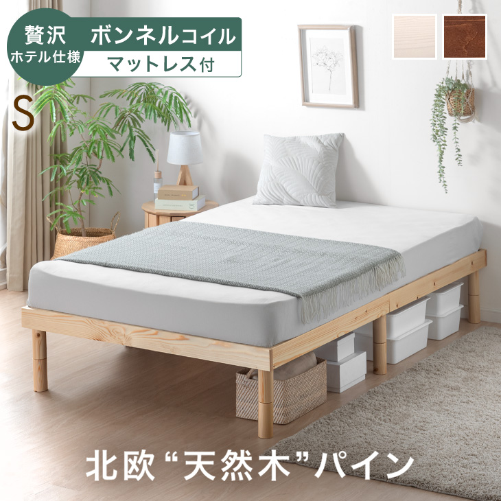 17日〜超お得 ベッド マットレス付き ピロートップ ボンネルコイル シングルベッド すのこベッド シングル 木製 ベッドフレーム 高さ調節 ベット マットレスセッ