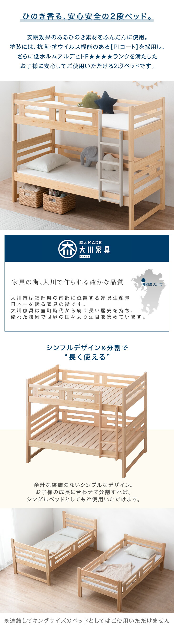 二段ベッド 日本製 ひのき 子供 大人用 分離 分割 2段ベッド おしゃれ 国産 すのこ コンパクト 超大型