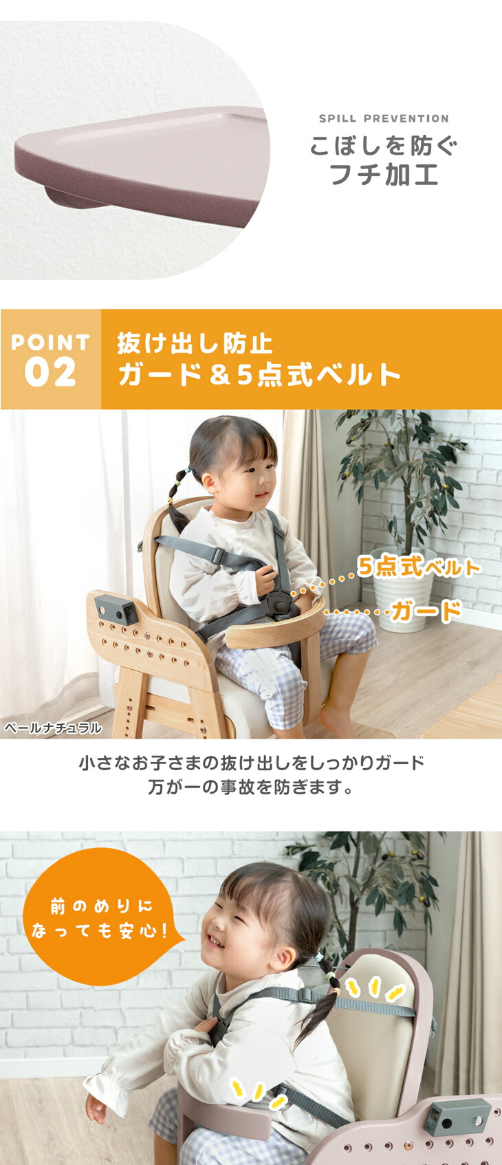 ※こちらのチェアの使用開始時期の「生後7か月」は目安の時期です。赤ちゃんの腰が据わって、一人でも座ることができるようになってから使用を開始してください。