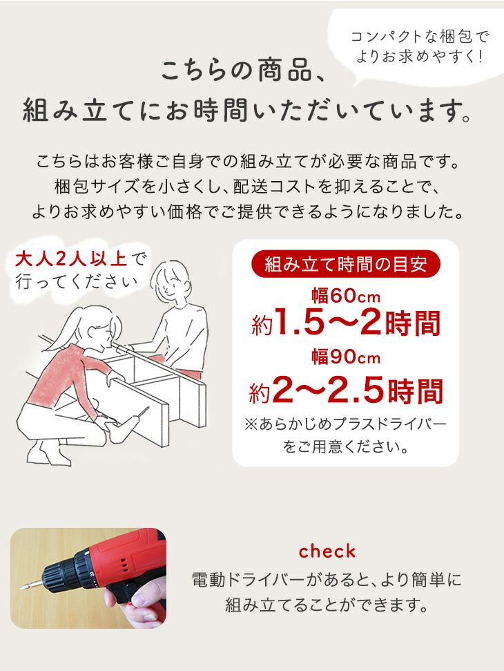 ■備考【インドネシア製】【組立品:大人2人で約1.5〜2時間(幅60cm)/大人2人で約2〜2.5時間(幅90cm】