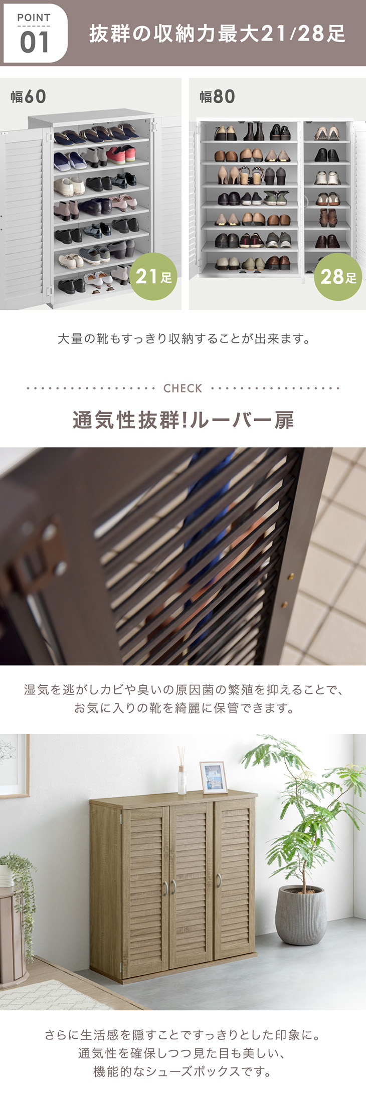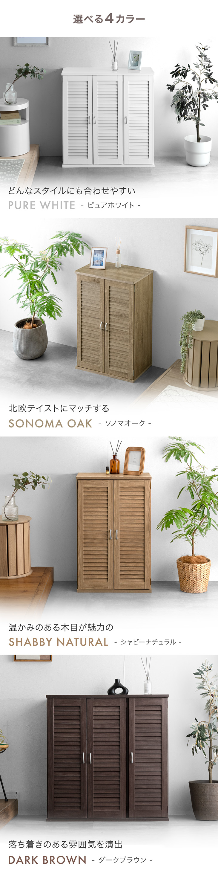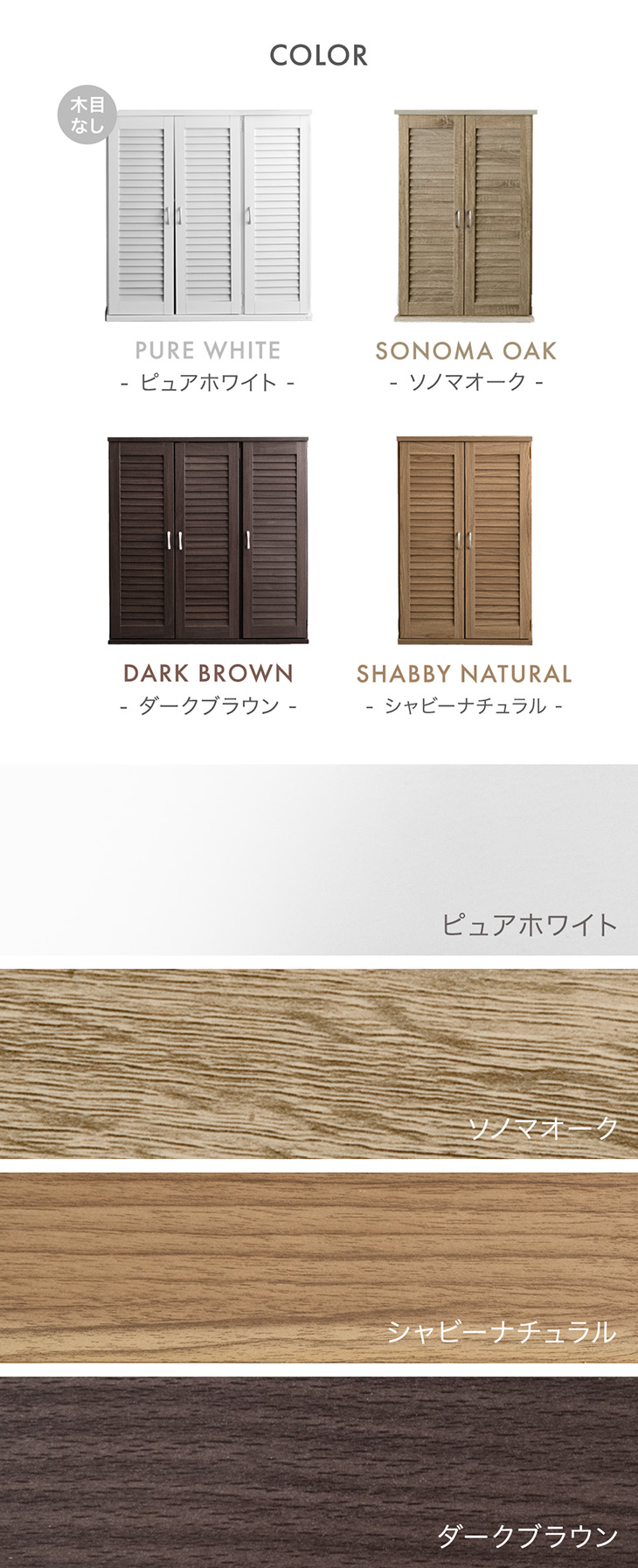 ピュアホワイト、ダークブラウン、 ソノマオーク、シャビ―ナチュラル