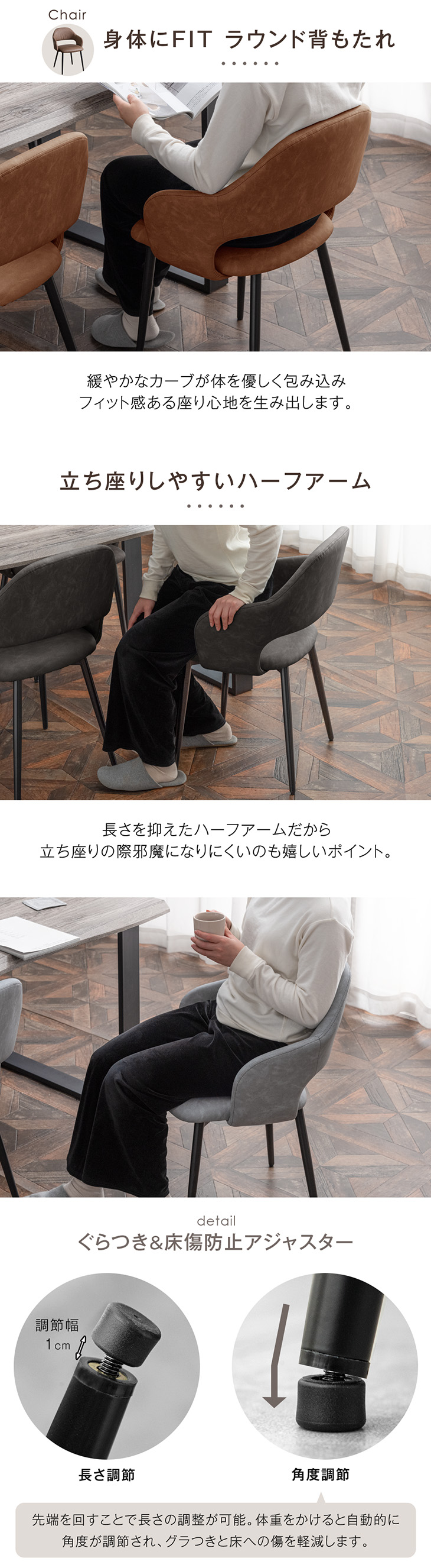 ※チェア/ベンチの脚先のアジャスターは斜めになっている場合がございますが、これは不良ではなく角度調整機能になります。加重により床と平行になりますので、ご安心下さいませ。