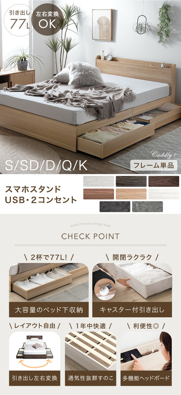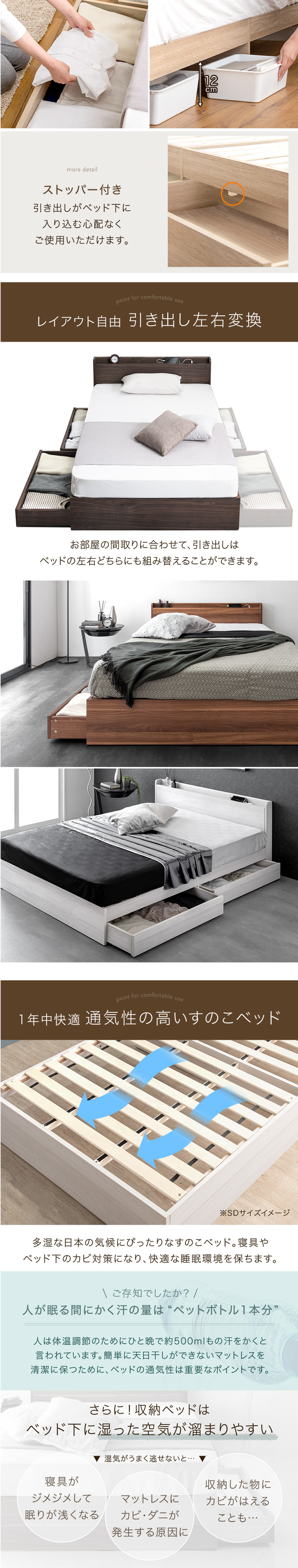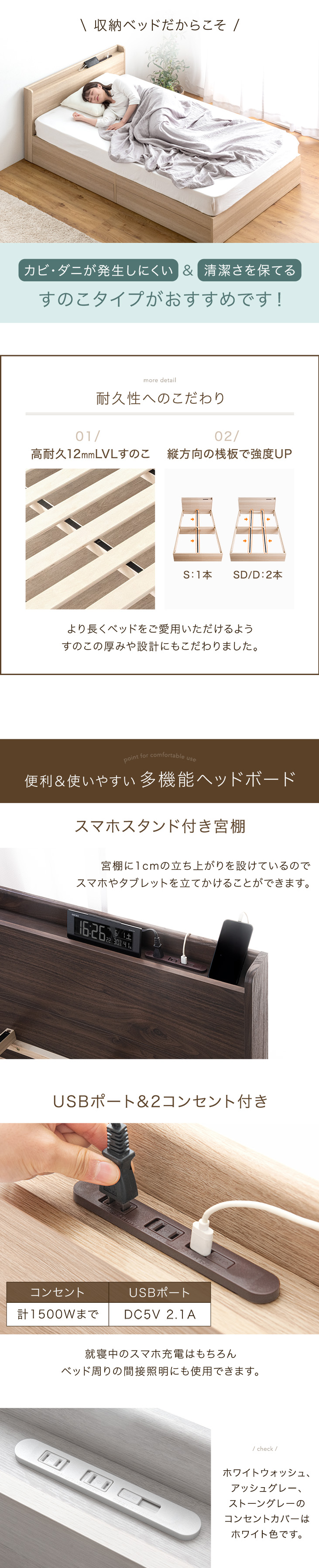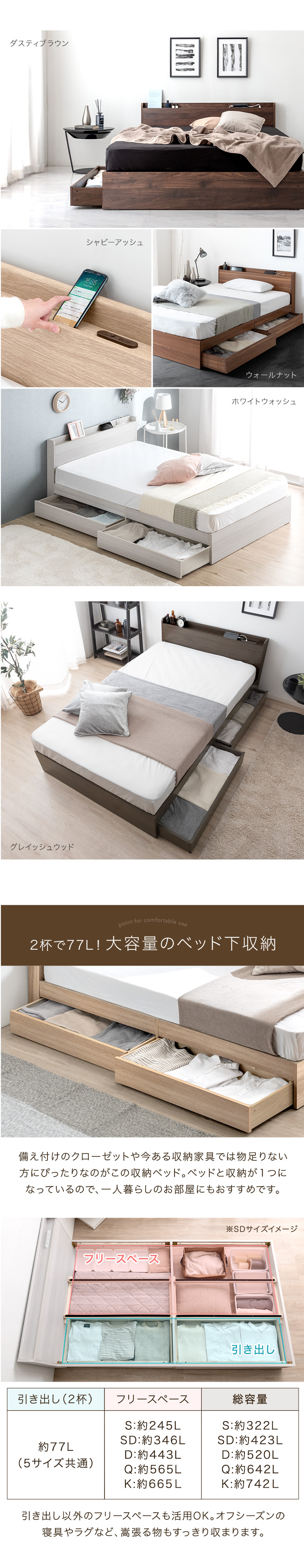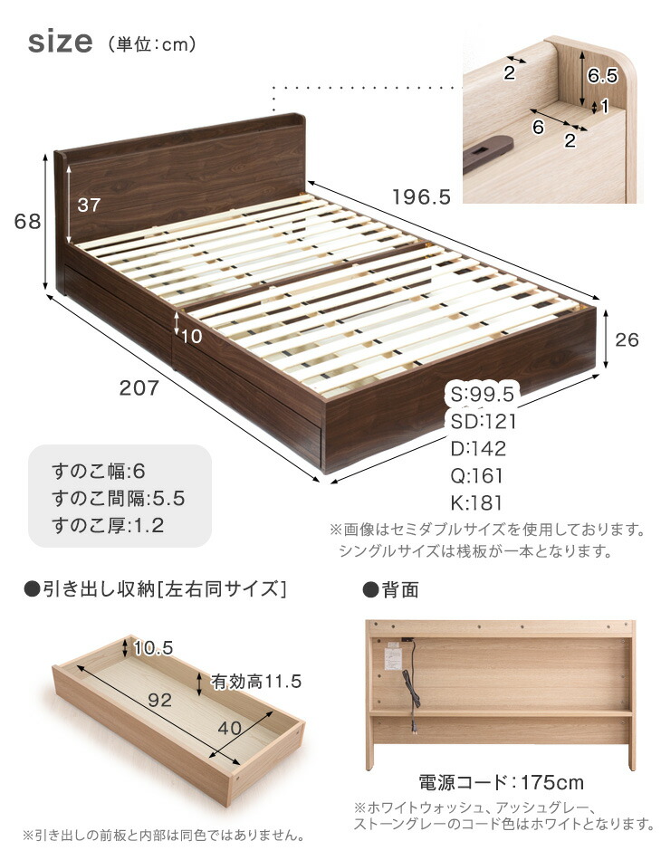 ベッド セミダブル ベッドフレーム 収納 すのこ おしゃれ 大容量 収納ベッド 白 ブラウン ナチュラル 木製 宮付 引き出し USBポート コンセント スマホスタンド
