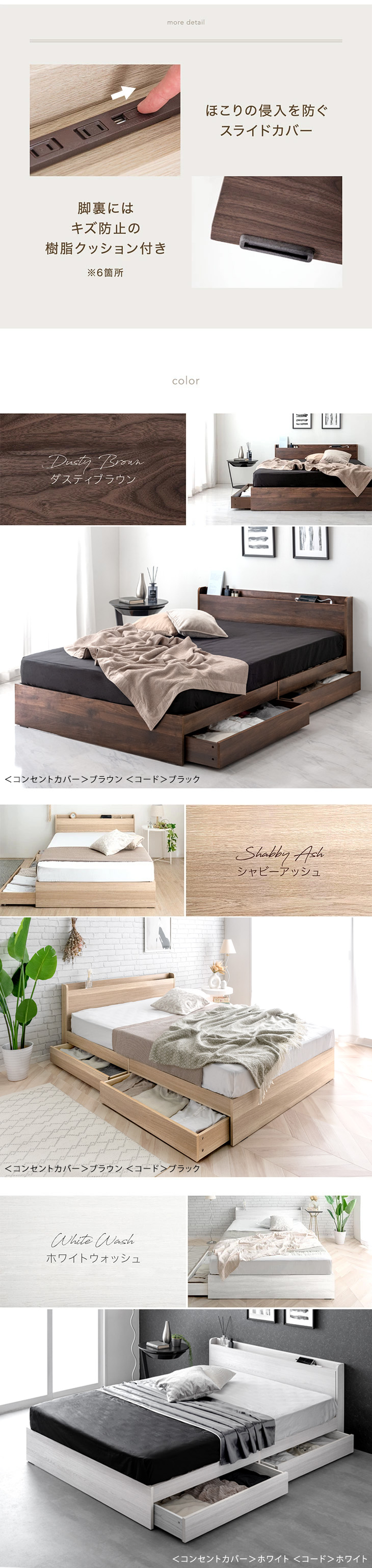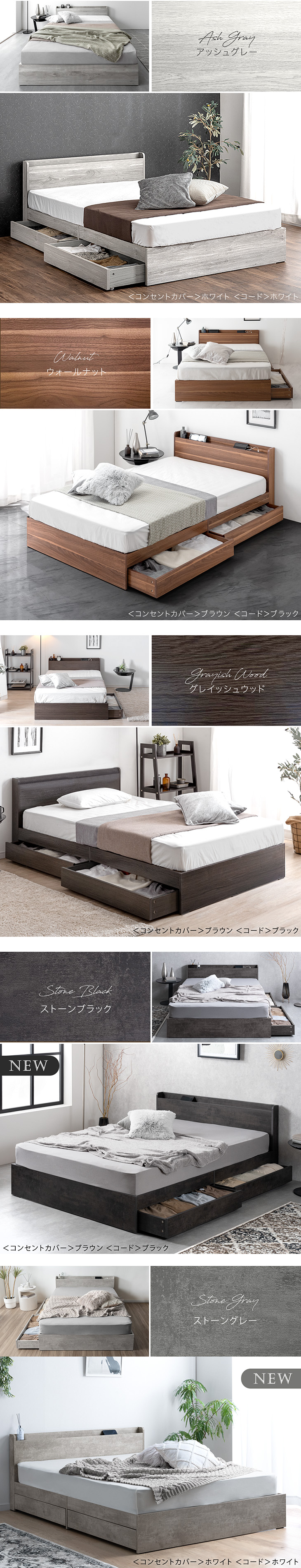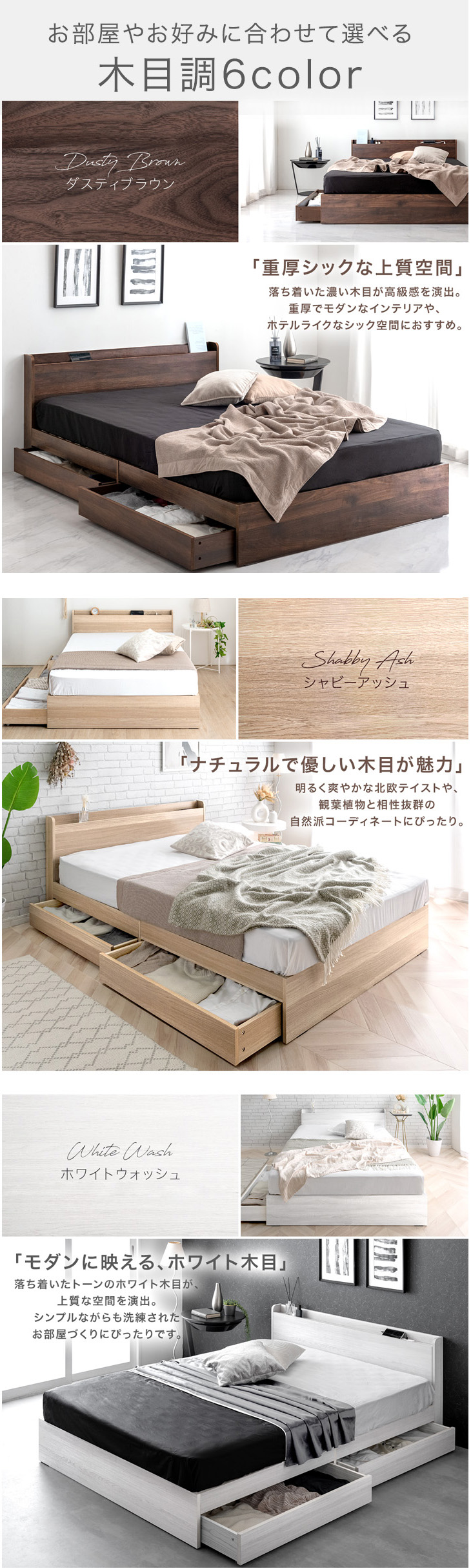 ホワイトウォッシュ、アッシュグレー、グレイッシュウッド、ウォールナット、ストーンブラック、ストーングレー