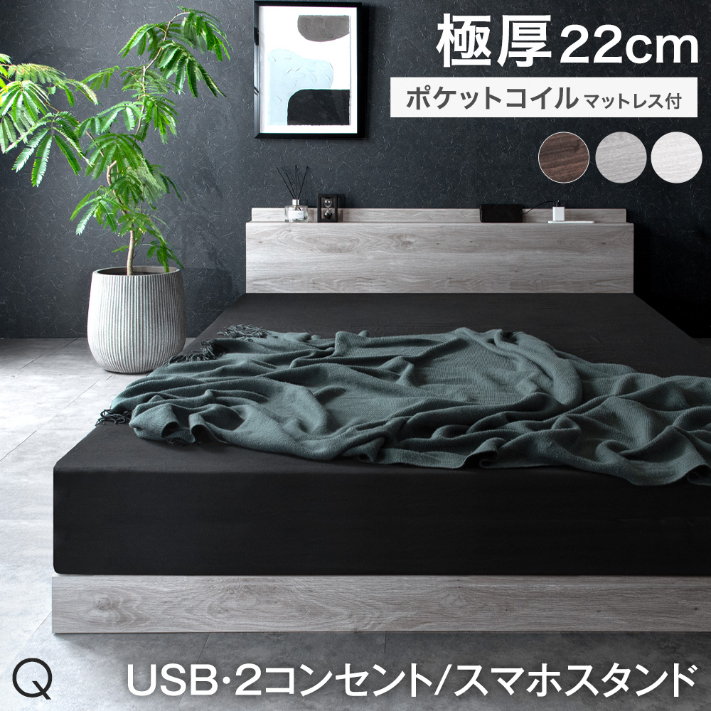 13日+5% ベッド マットレス付き クイーンベッド 2口コンセント付き宮棚 ローベッド マットレス付き クイーン 連結 フレーム フロアベッド ポケットコイルマッ