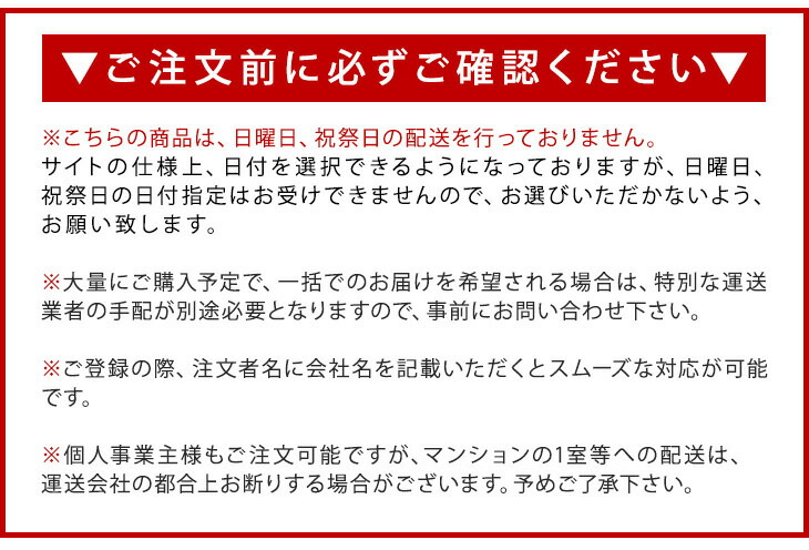 ※配送は全て宅配便(1人)での玄関渡しとなります。大型商品や重量商品、エレベーターの無い2階以上にお住まいのお客様は、玄関口までの搬入をお手伝いをお願いしております事をご了承ください。