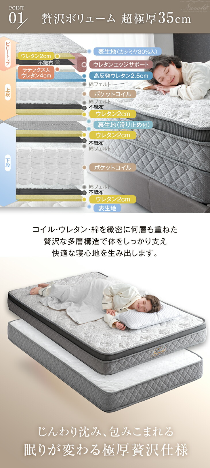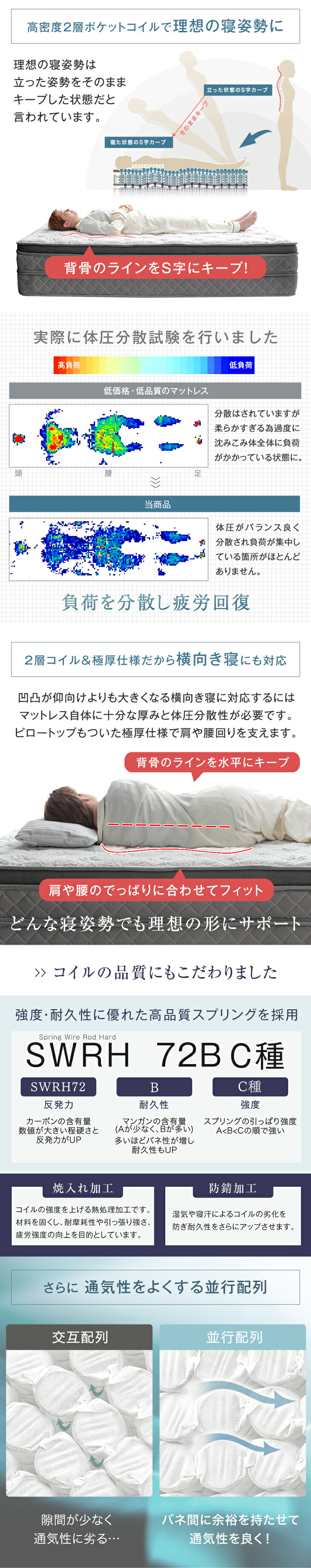 13日+5% マットレス シングル 超極厚35cm ピロートップ Wポケットコイル 抗菌 防ダニ 防臭 3Dメッシュ 体圧分散 ポケットコイル シングルマットレス