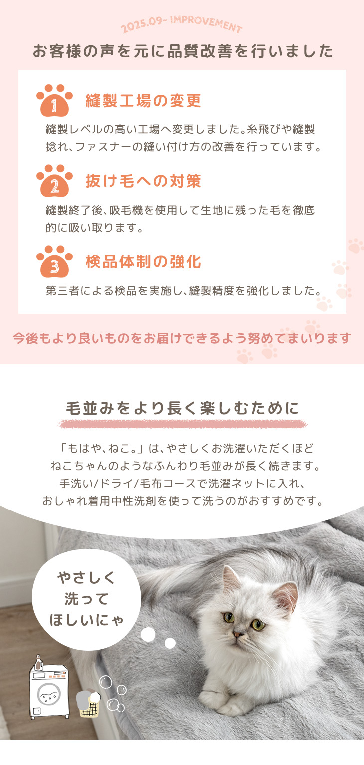 生地:ポリエステル100%カチオン生地(340g/m2、静電気防止カーボン糸、ねこ温感シート+3.8℃加工)