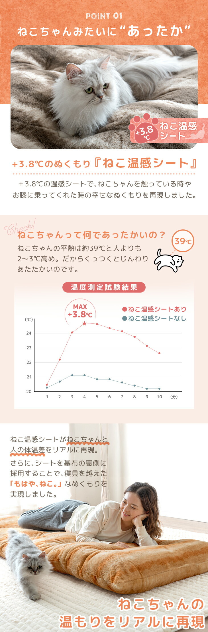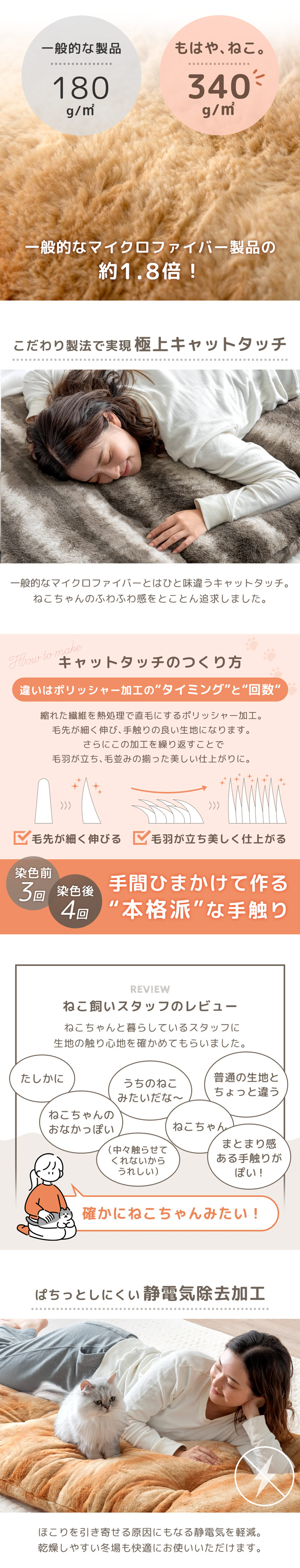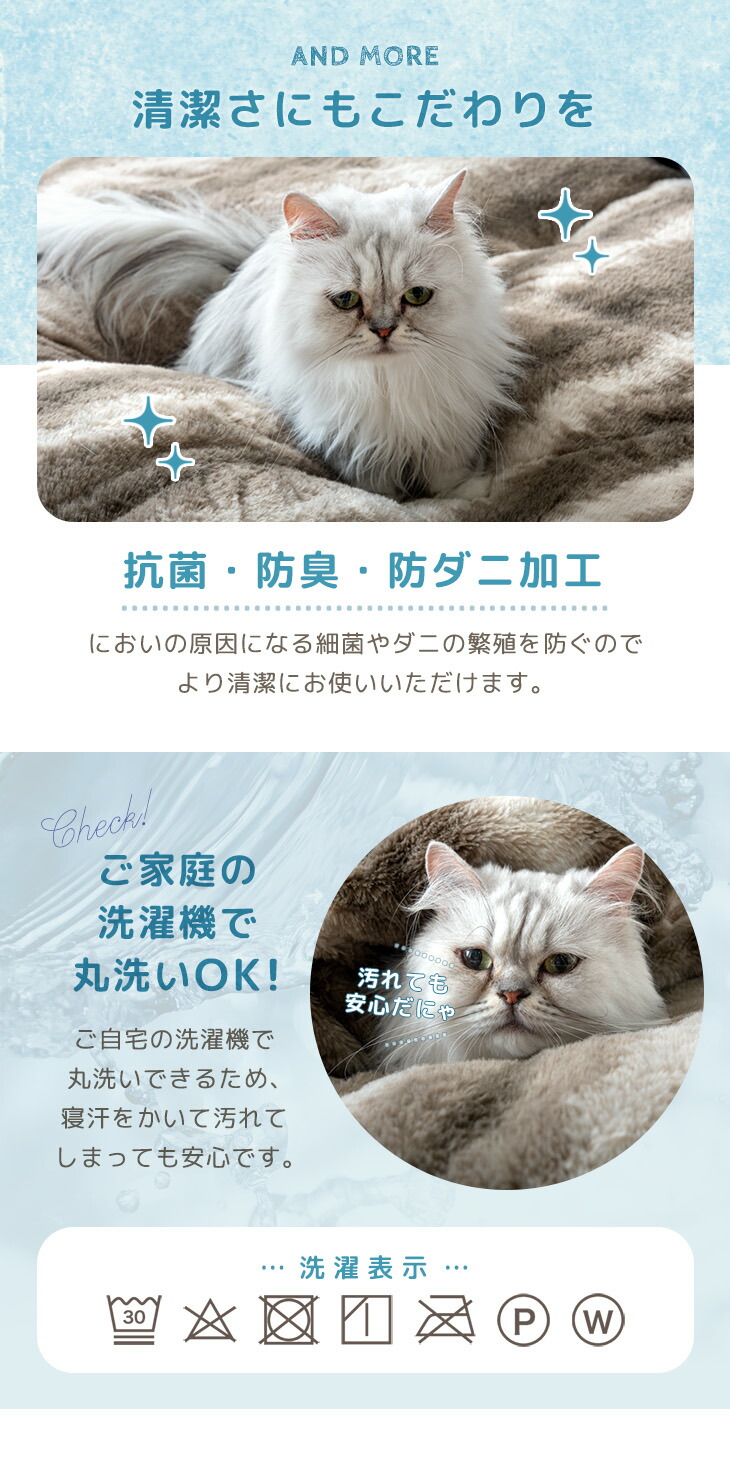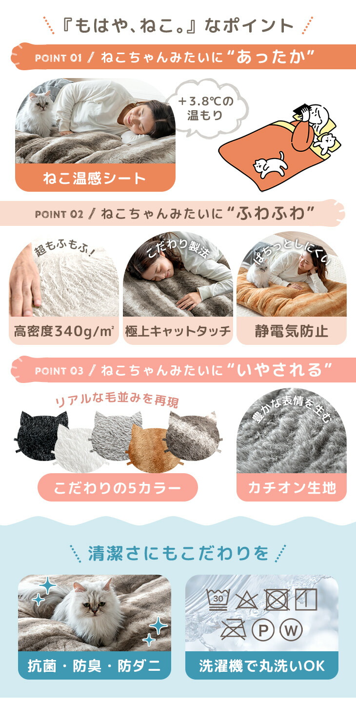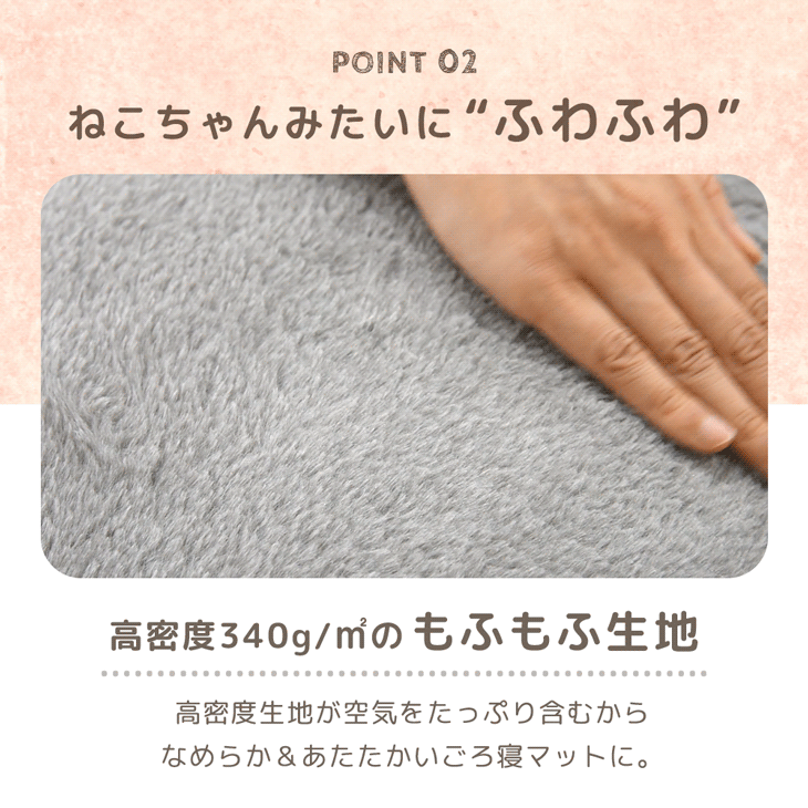 生地:ポリエステル100%カチオン生地(340g/m2、静電気防止カーボン糸、ねこ温感シート+3.8℃加工)