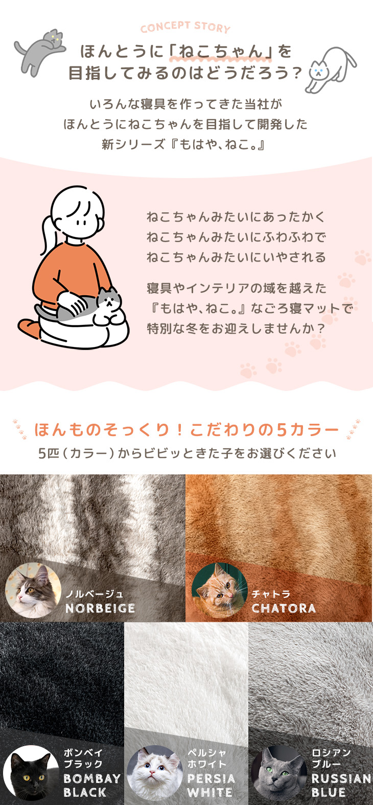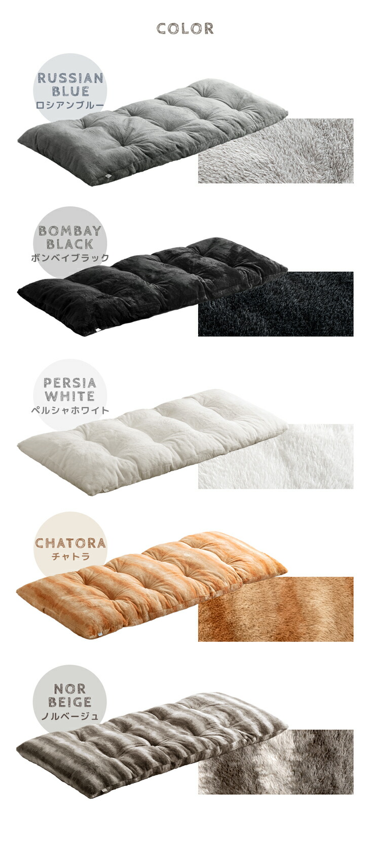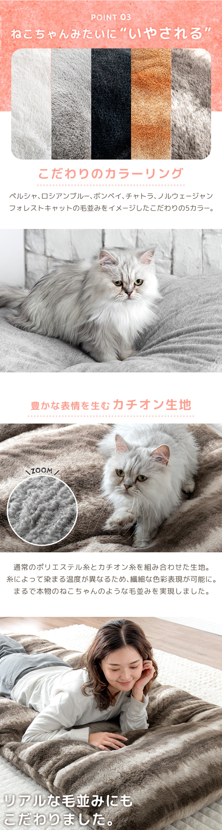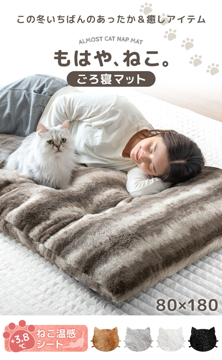 生地:ポリエステル100%カチオン生地(340g/m2、静電気防止カーボン糸、ねこ温感シート+3.8℃加工)