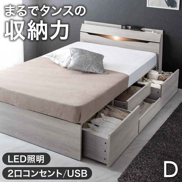 ベッド ダブル 収納 すのこベッド ベッドフレーム 大容量 おしゃれ ダブルベッド ローベッド 収納ベッド 宮付き USB コンセント付 木製 すのこ 超大型