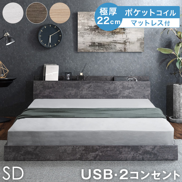 ベッド マットレス付き 極厚22cm ポケットコイル セミダブルベッド ローベッド セミダブル コンセント付き ロー ベット マットレスセット すのこ usb