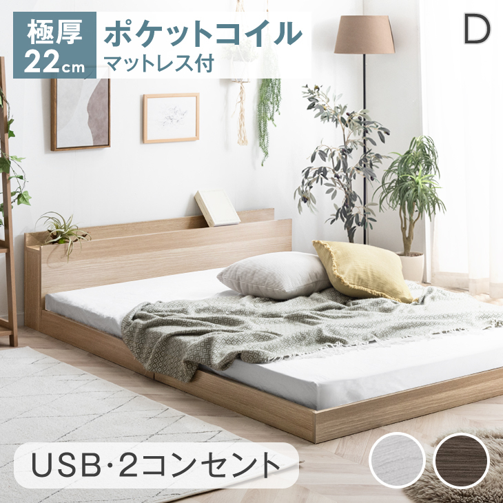 ベッド マットレス ダブル ベッドフレーム マットレスセット ポケットコイル コンセント 2口 宮棚 マットレス付き ダブルベッド フレーム ダブルサイズ セット