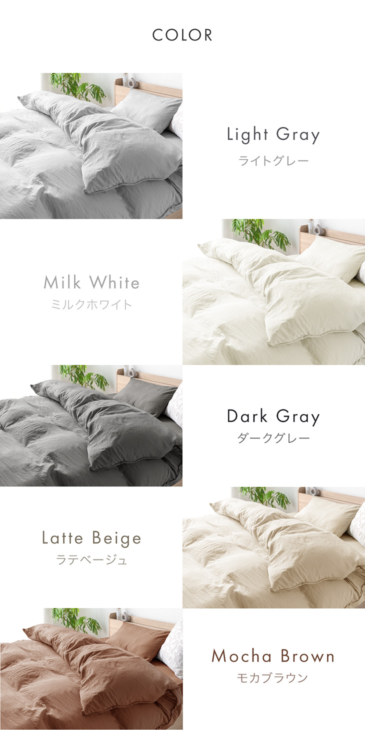 ミルクホワイト、ライトグレー、ダークグレー、ラテベージュ、モカブラウン