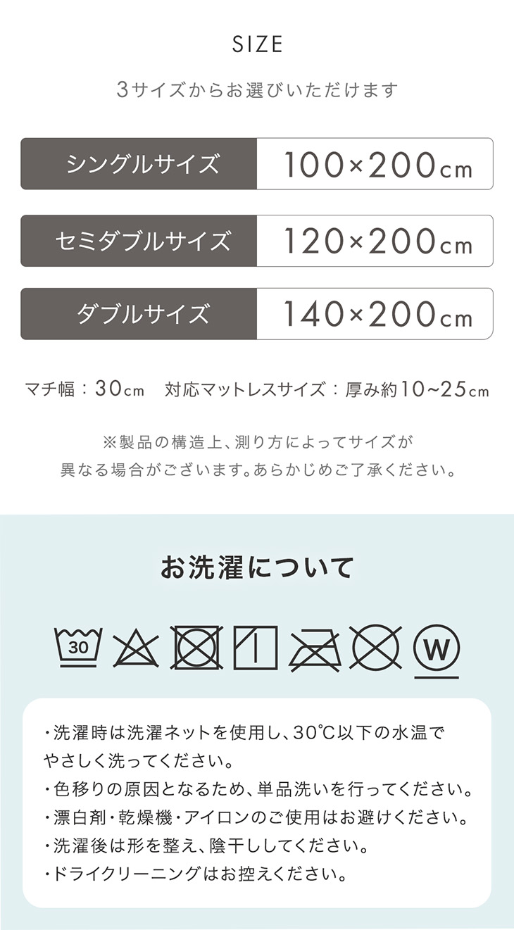 マチ幅:30cm ※厚み約10〜25cmまでのマットレスに対応