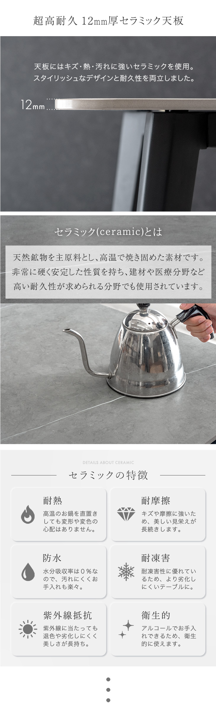 ※熱に強いセラミックは高温で焼き上げるため熱に強く、熱い鍋などを直接置いても変色や変形が起こりにくい高い耐熱性がありますが、天板の表面が熱くなるので鍋敷きなどの使用をおすすめします。