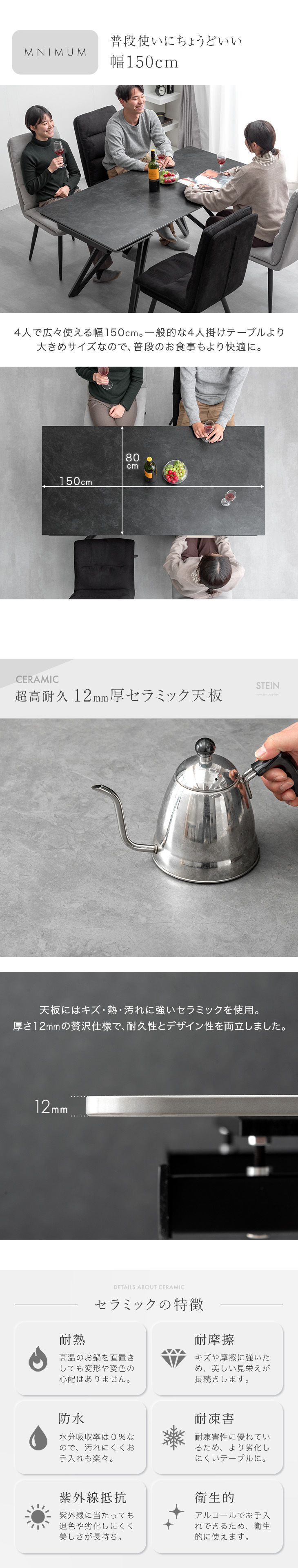 ※熱に強いセラミックは高温で焼き上げるため熱に強く、熱い鍋などを直接置いても変色や変形が起こりにくい高い耐熱性がありますが、天板の表面が熱くなるので鍋敷きなどの使用をおすすめします。