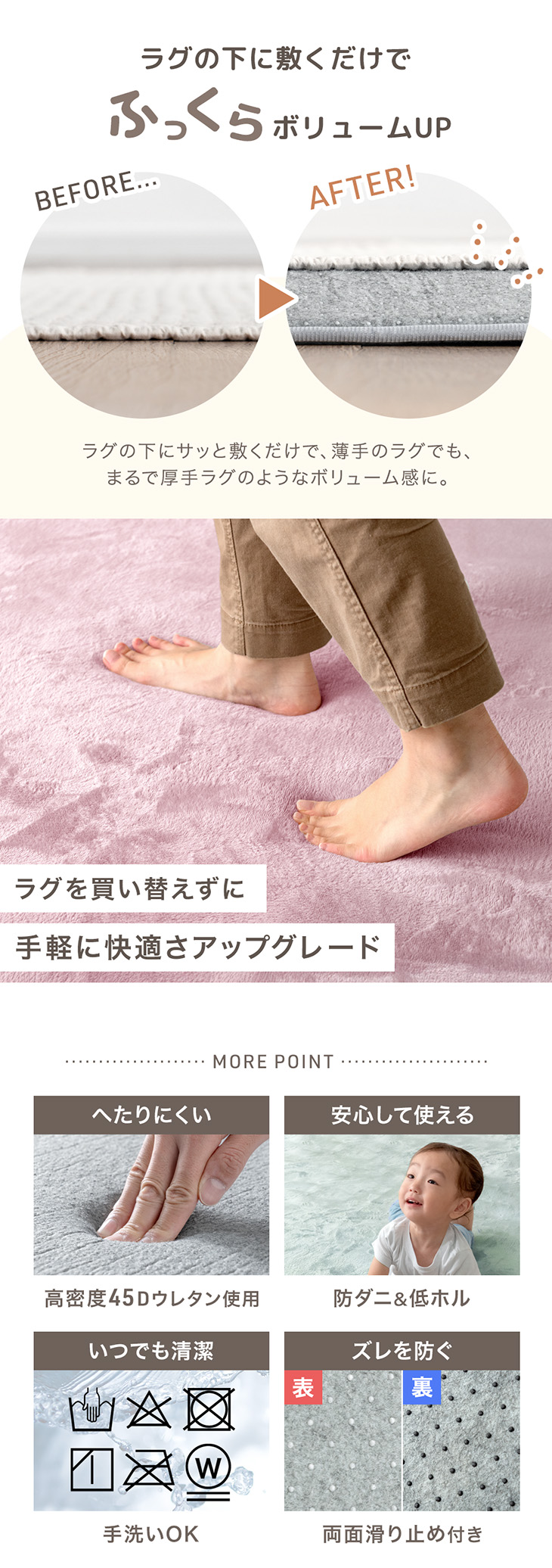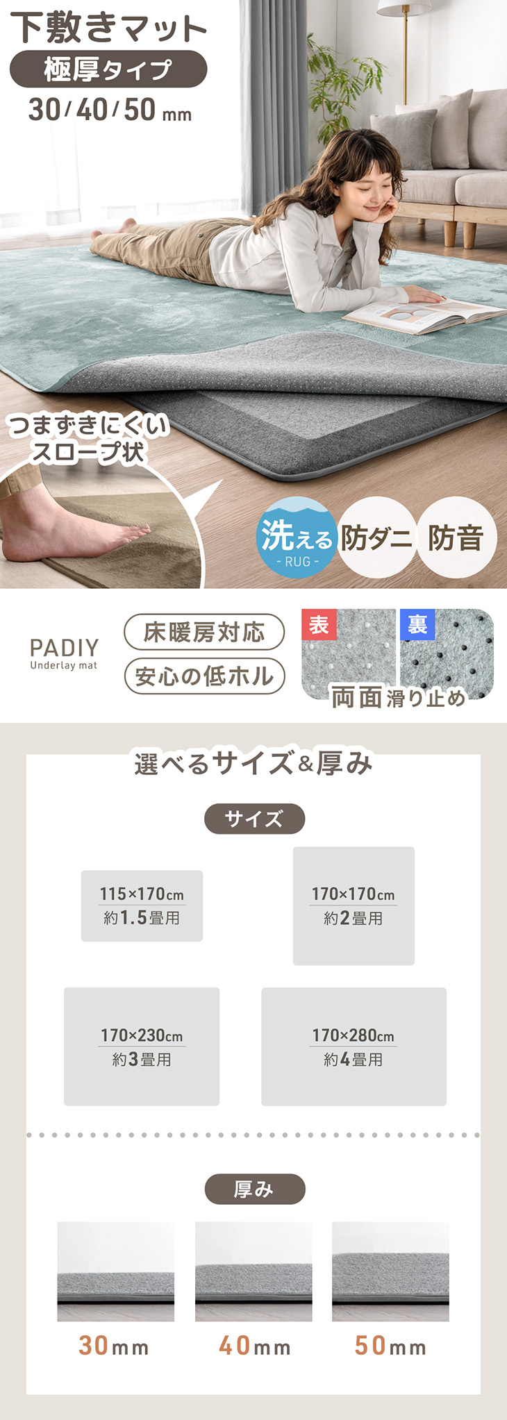 17日+5% 下敷きマット 洗える ラグ 下敷き 極厚 30mm 170×230 マット ラグ用 3畳 下敷きラグ 床暖房 ラグマット カーペット 防音 防ダニ 滑り止め 子供