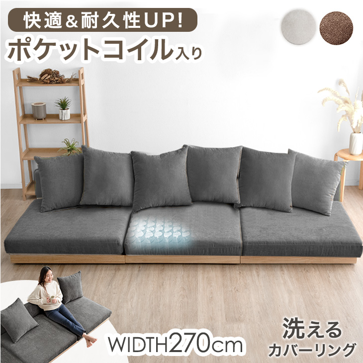 17日〜超お得 ソファー 4人掛け 3人掛け ポケットコイル 洗えるカバー 幅270 北欧 おしゃれ 天然木 ローソファ ソファ シンプル