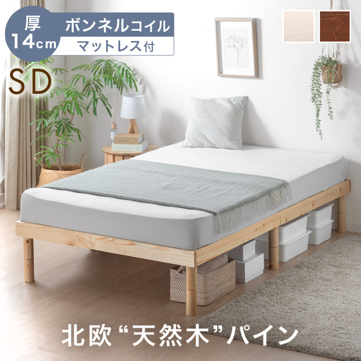 ベッド マットレス付き セミダブル 厚14cm ボンネルコイル セミダブルベッド すのこベッド 木製 ベッドフレーム 高さ調節 ベット マットレスセット