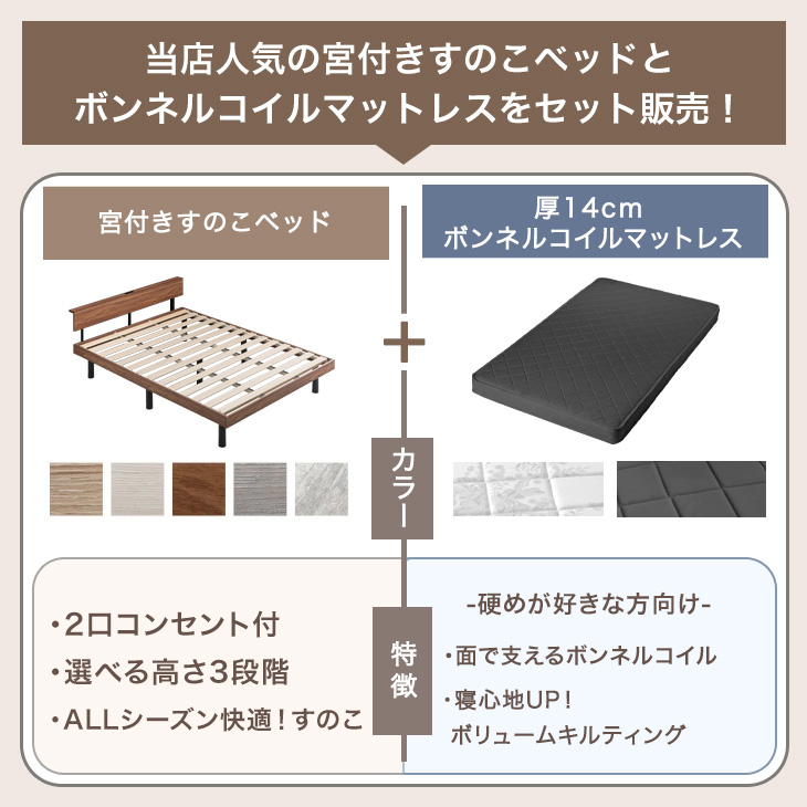 ベッド マットレス付き 厚14cm ボンネルコイル セミダブルベッド 3段階 高さ調整 セミダブル すのこベッド コンセント付き 宮付き マットレスセット