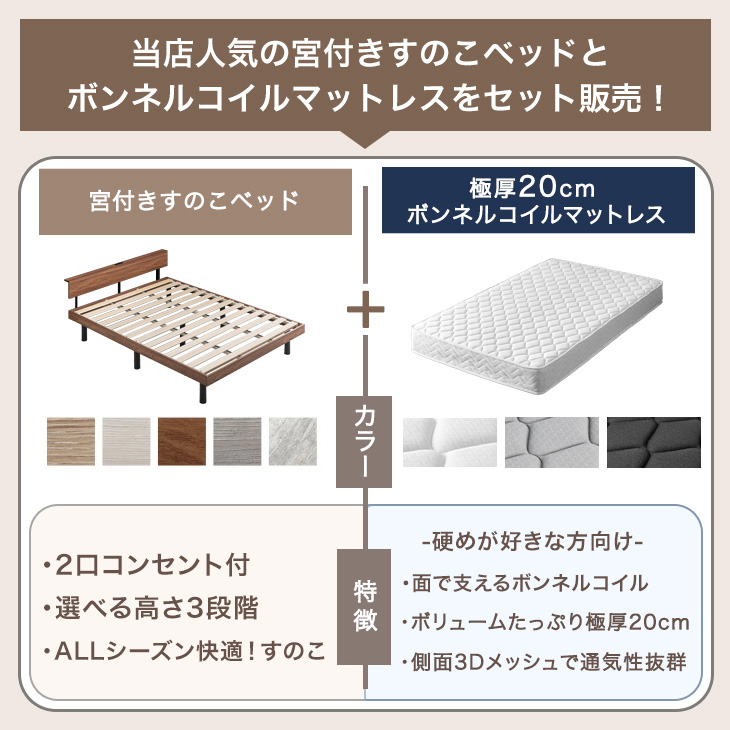 ベッド マットレス付き 極厚20cm ボンネルコイル シングルベッド 3段階 高さ調整 シングル すのこベッド コンセント付き 宮付き マットレスセット