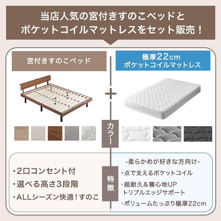 ベッド マットレス付き 極厚22cm ポケットコイル シングルベッド 3段階 高さ調整 シングル すのこベッド コンセント付き 宮付き マットレスセット