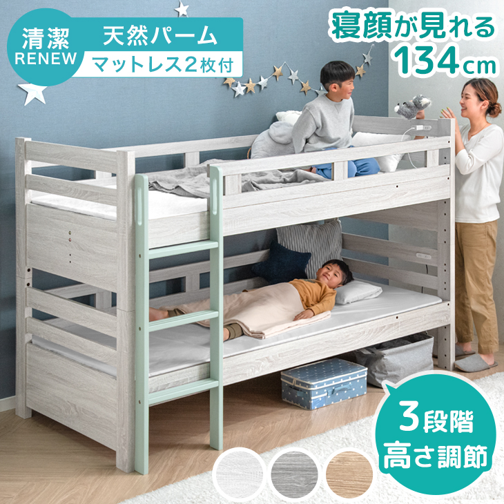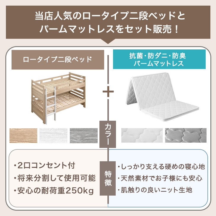 二段ベッド マットレス付き パームマットレス 抗菌 防ダニ 防臭 2段ベッド 子供 マット付き ロータイプ コンセント 分離 分割可能 2段ベット 超大型