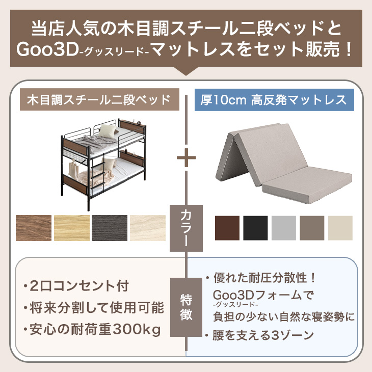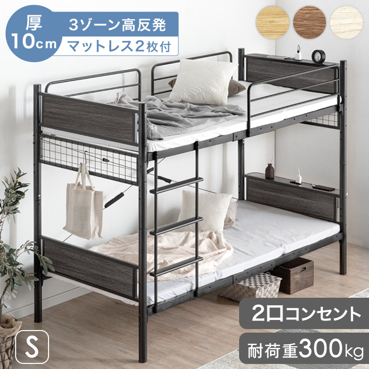 22日+5% 二段ベッド マットレス付き 高反発 マットレスセット 頑丈 パイプ スチール 宮付き 2段ベッド 子供 マット付き コンセント 分離 分割可能 2段ベット