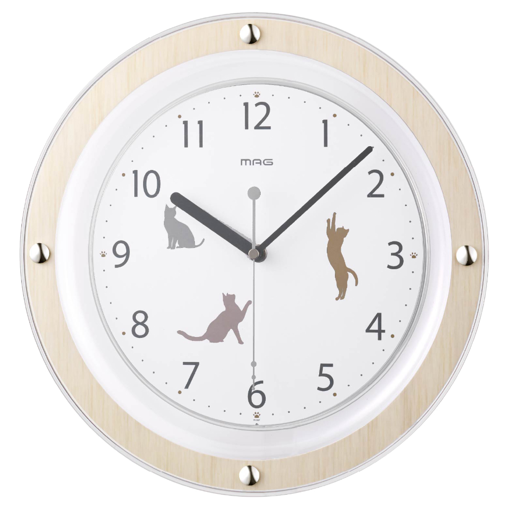 ●猫と過ごす毎日、インテリアになじむ掛時計 ●時間と一緒に遊ぶ猫。針とじゃれ合う姿で癒しを届けるデザイン時計+-----+-----+-----+-----+-----+ 連続秒針 製品サイズ(H×W×D):315×315×52mm、480g 電源:単3形マンガン乾電池x1 材質:枠/PS樹脂、風防/PS樹脂 中国製+-----+-----+-----+-----+-----+