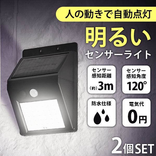 LEDソーラーライト 2個セット センサーライト 人感 防水 玄関 30LED 3m 昼光色 防犯 自動照明 太陽光充電 ソーラー充電