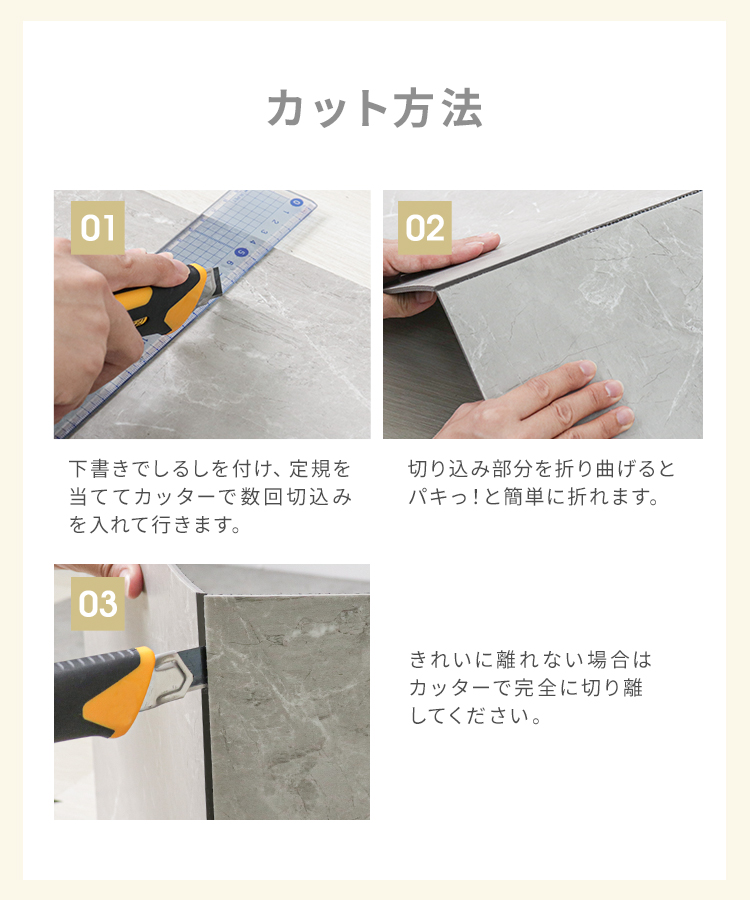 ・気温が低い場合は、接着力が弱くなりますので部屋を温めるかドライヤー等で商品を暖めてから作業してください。